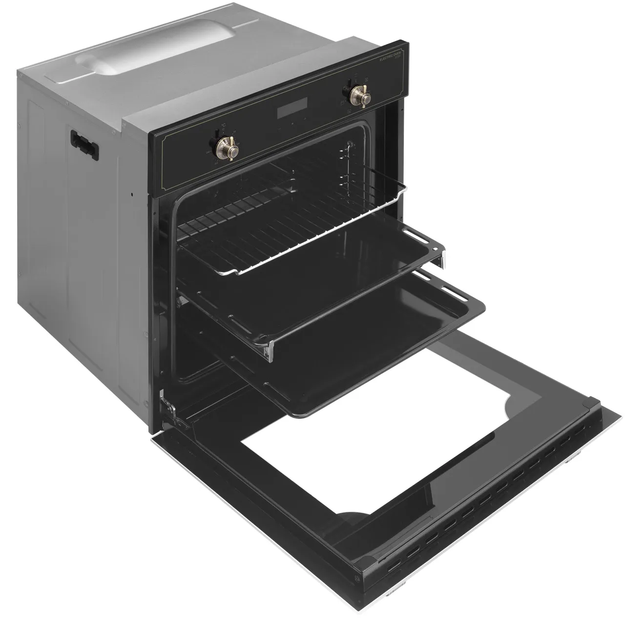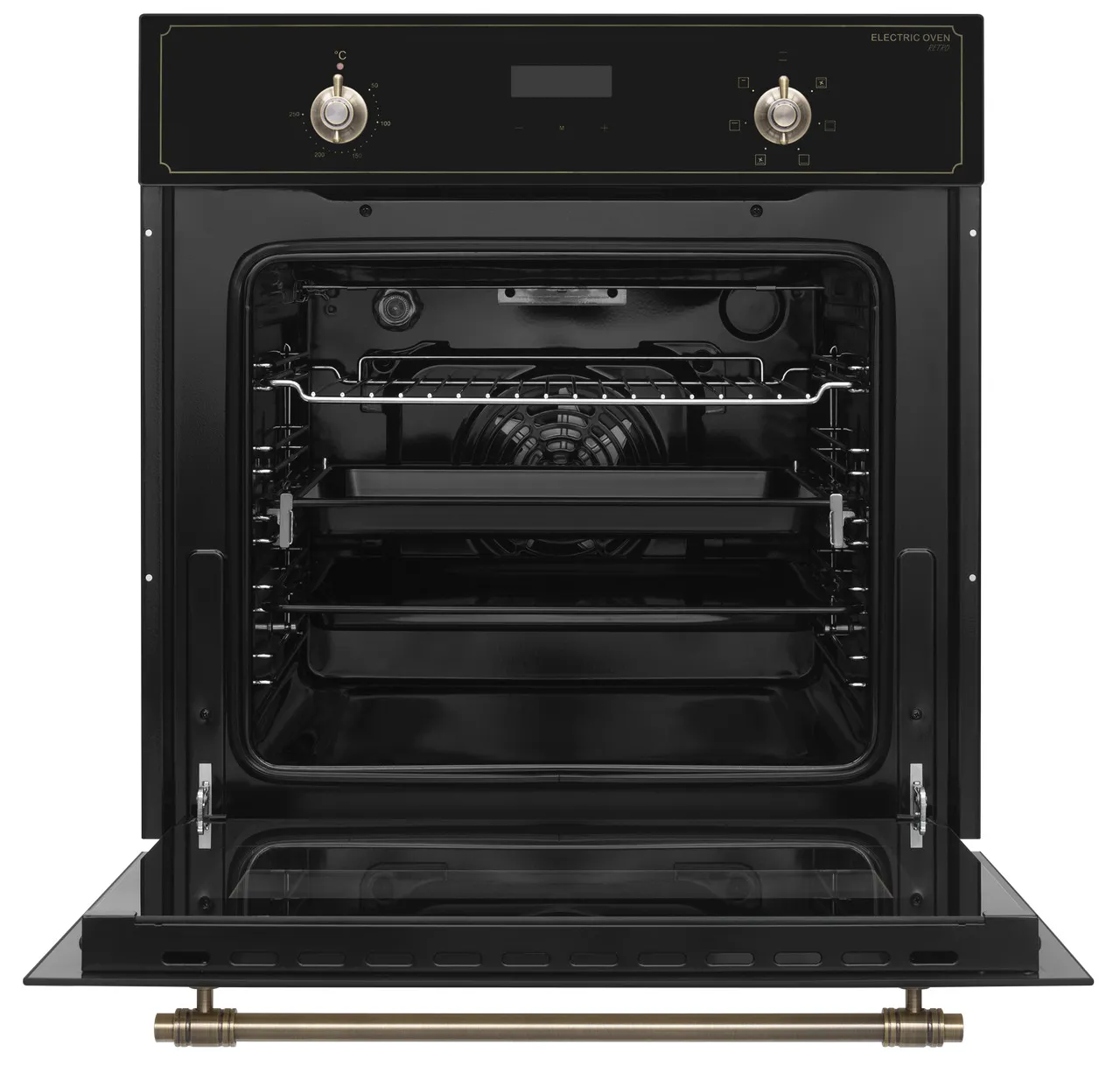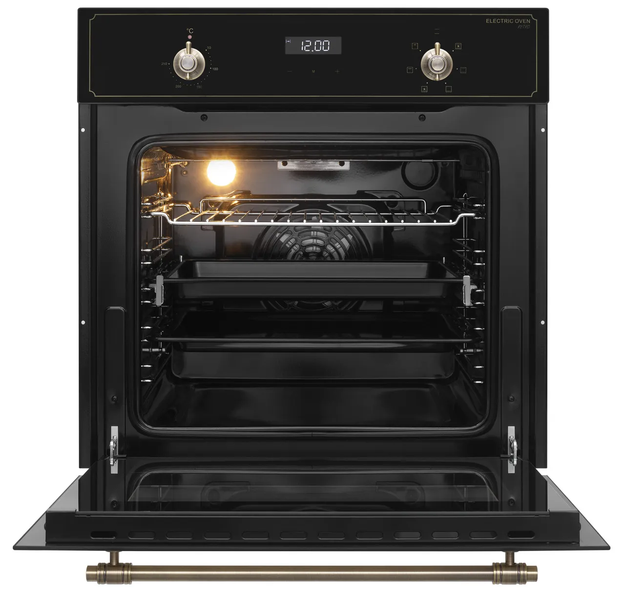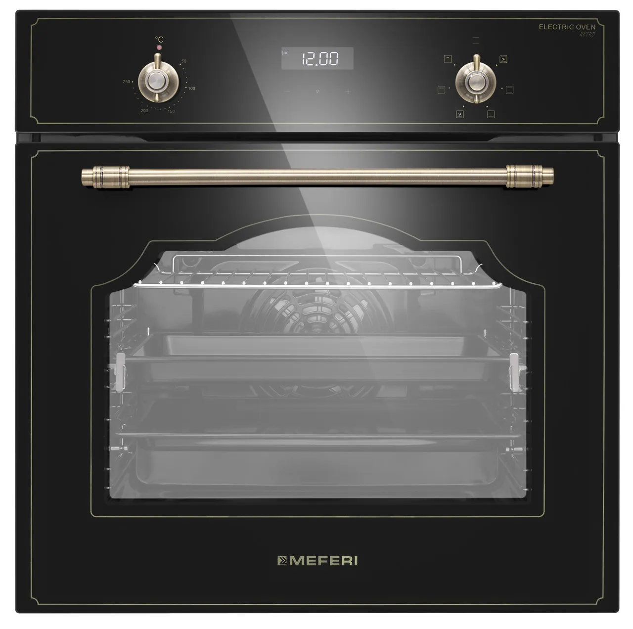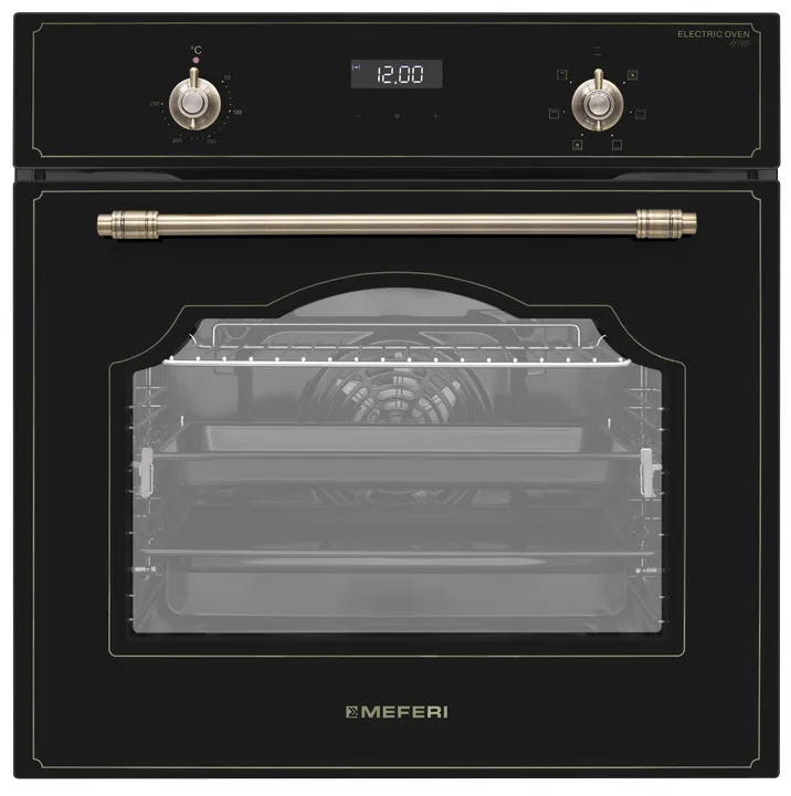 MEFERI MEO606BK RETRO — черный духовой шкаф в ретро‑стиле, который становится выразительным акцентом на кухне и при этом сохраняет все возможности современной техники. Он помогает удобно запекать, выпекать и подогревать блюда, сочетая классический дизайн с продуманной функциональностью.