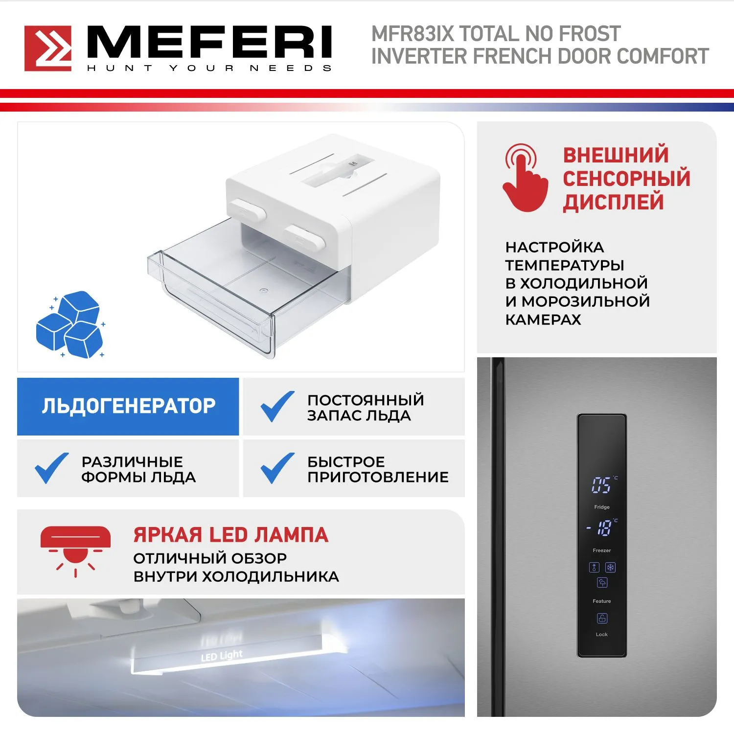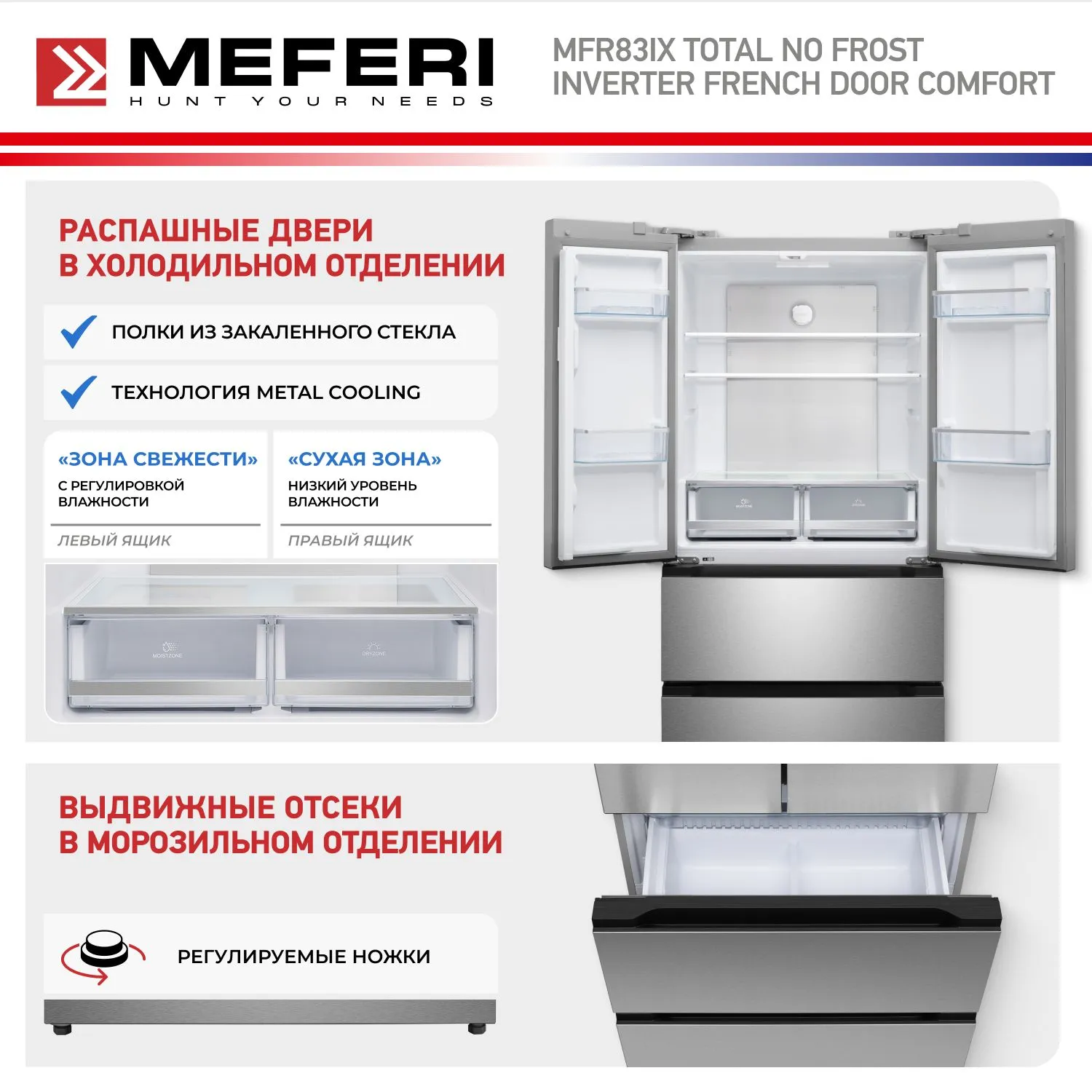 Холодильник отдельностоящий, с инвертором MEFERI MFR83IX TOTAL NO FROST FRENCH DOOR COMFORT, двухкамерный, с зоной свежести, с льдогенератором