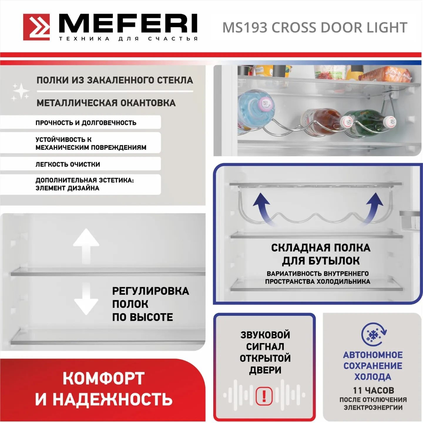 Комплект MEFERI MS193 CROSS DOOR LIGHT из двух холодильников MEFERI MBR193 LOW FROST LIGHT — оптимальный выбор для вашей кухни, объединяющий стиль, удобство и надежность в одной системе.