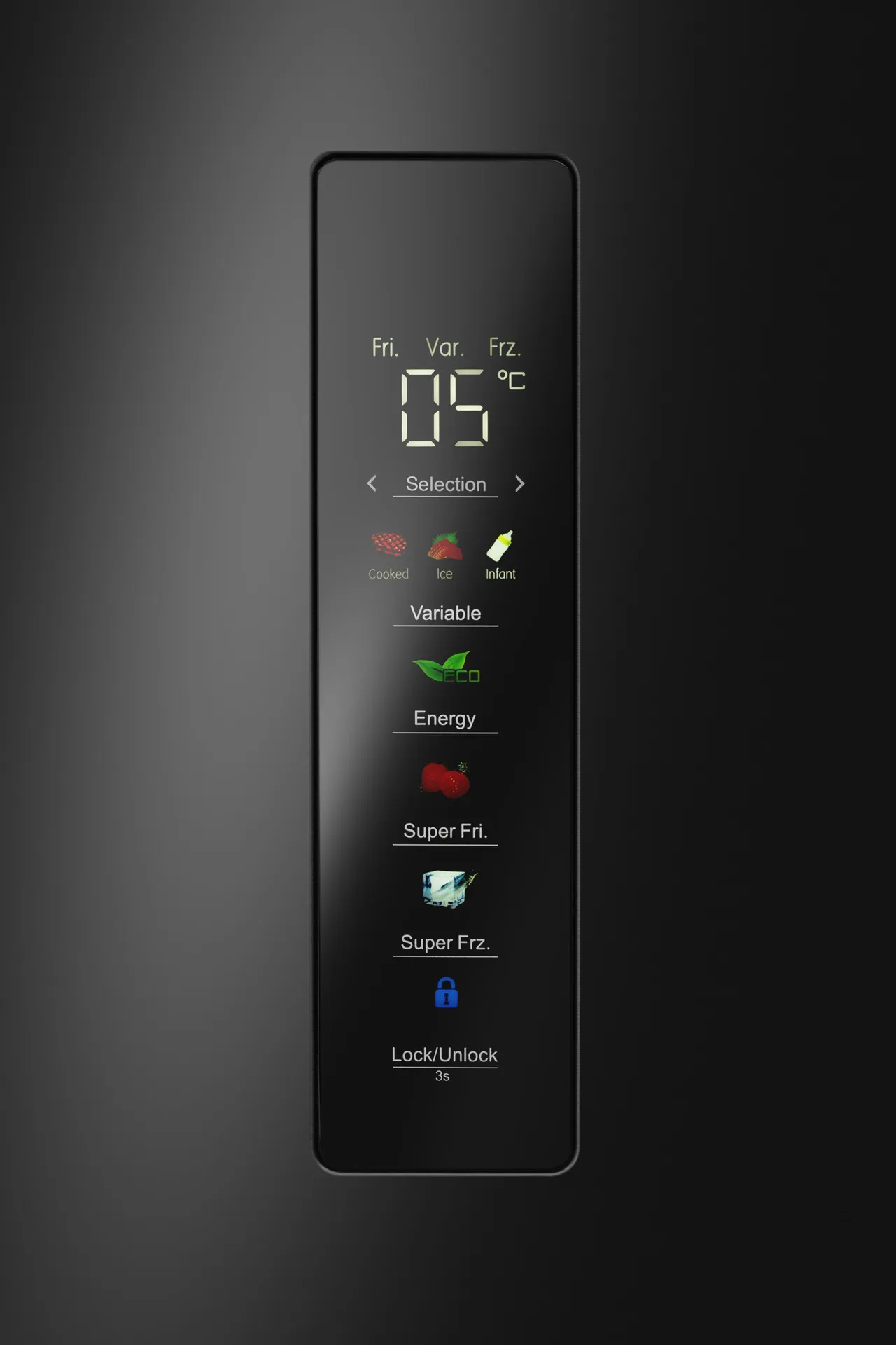 - Сенсорное управление с внешним цветным дисплеем позволяет удобно контролировать температурные режимы и включать функции суперохлаждения и суперзаморозки.