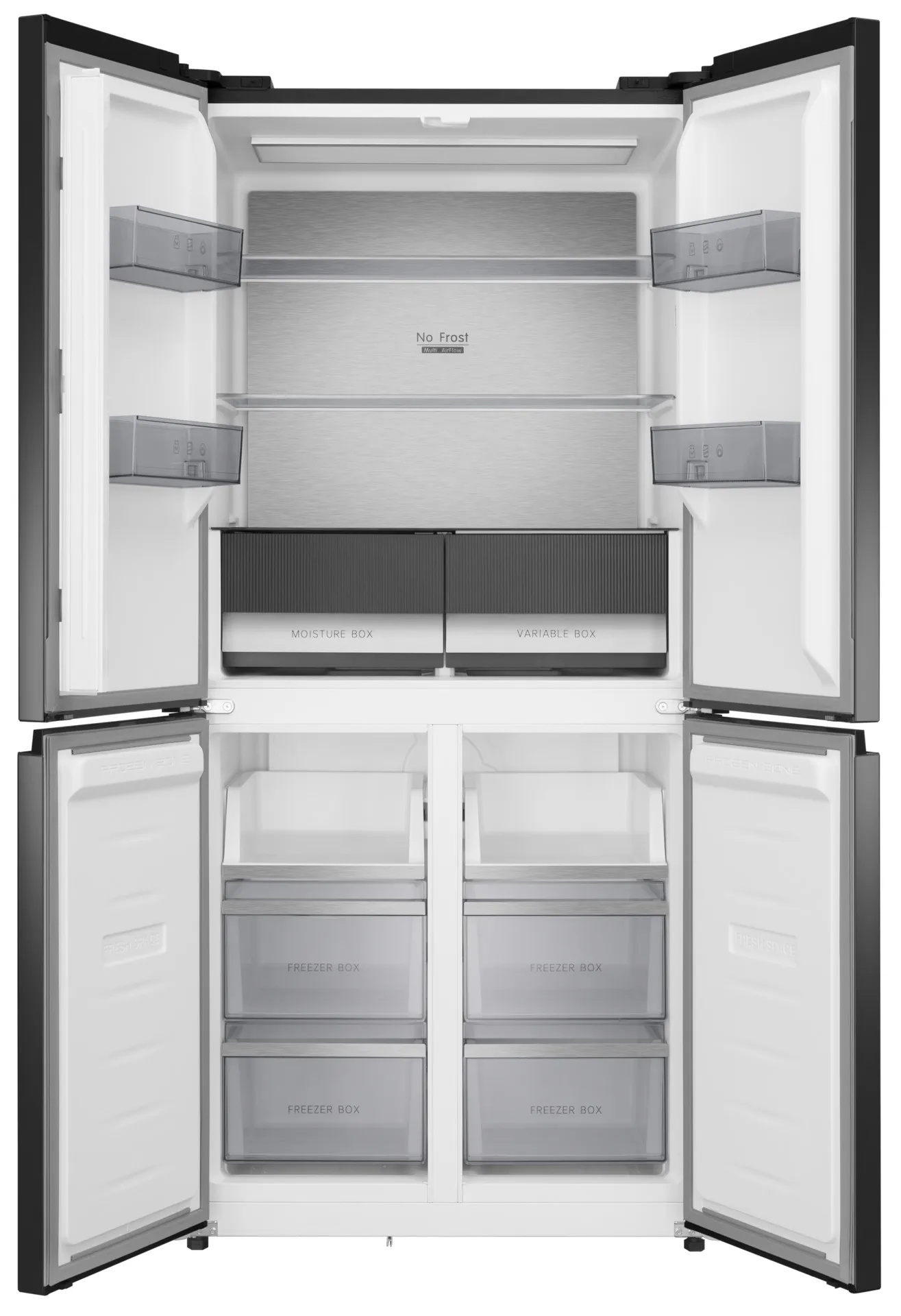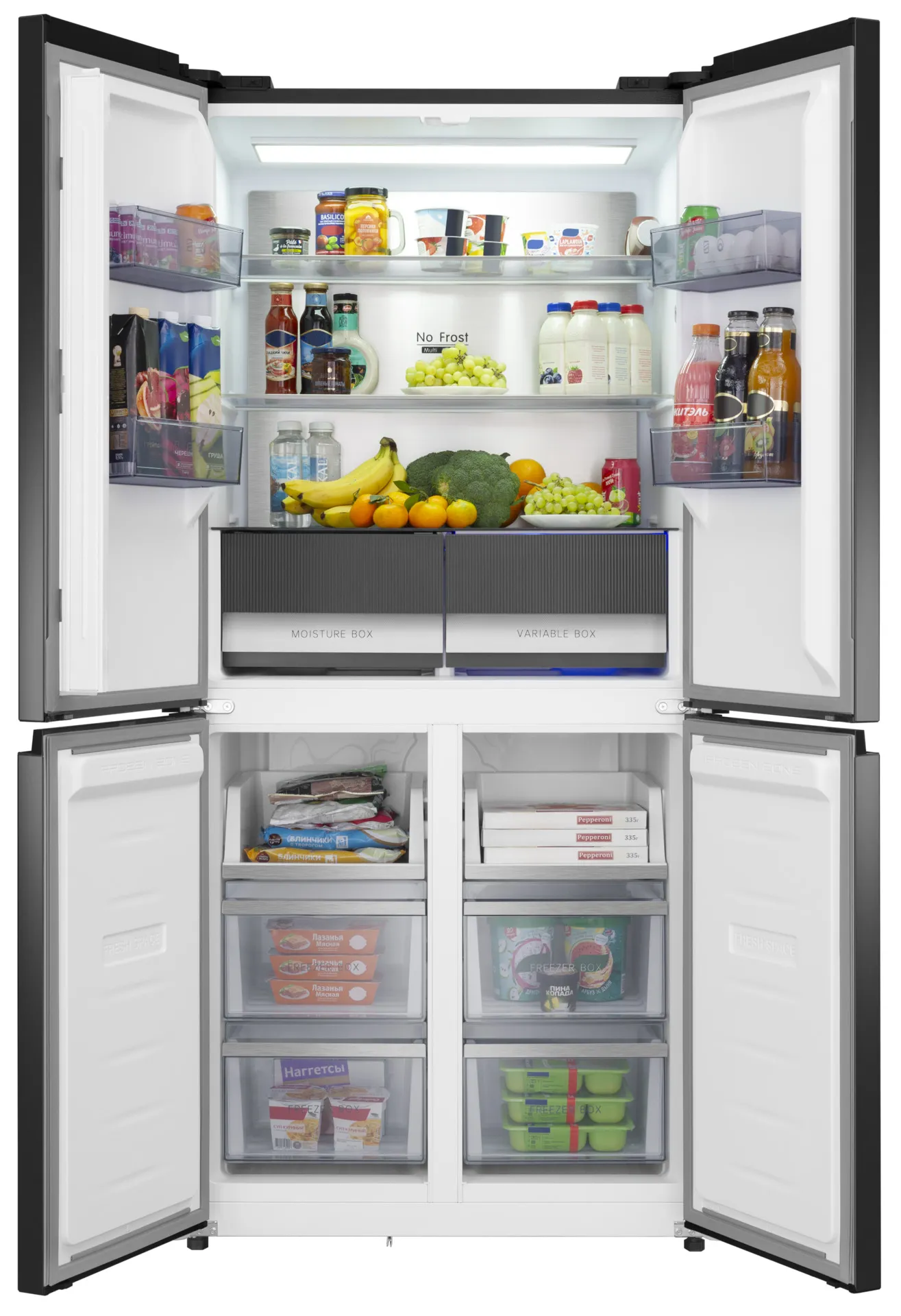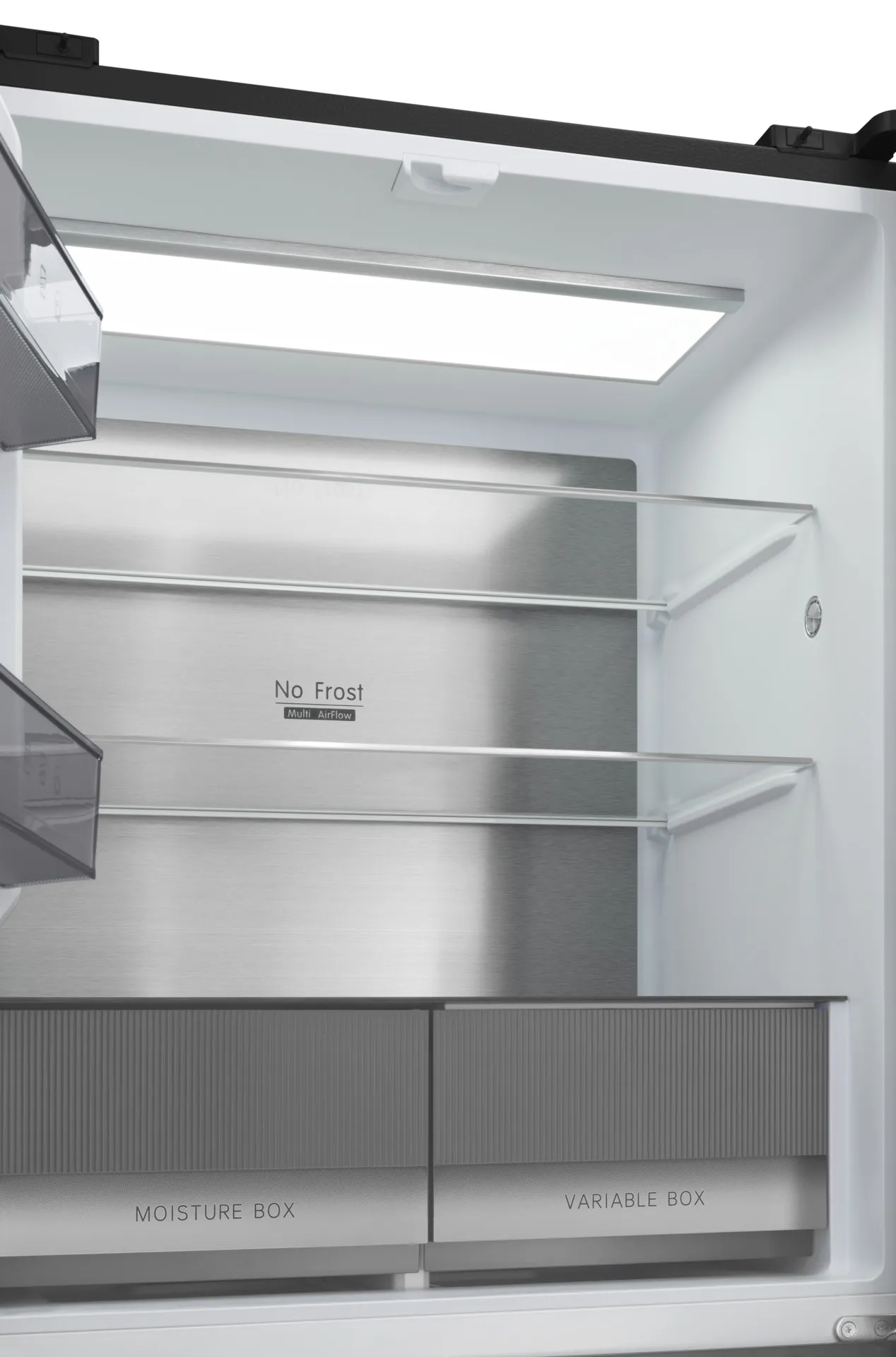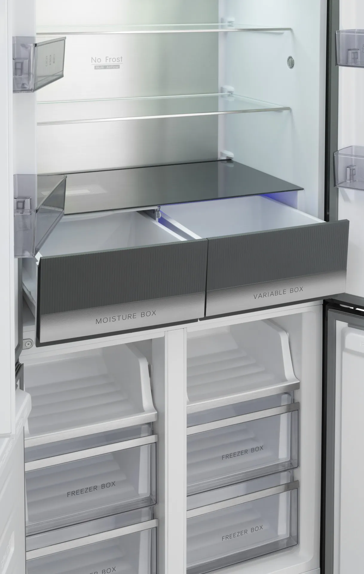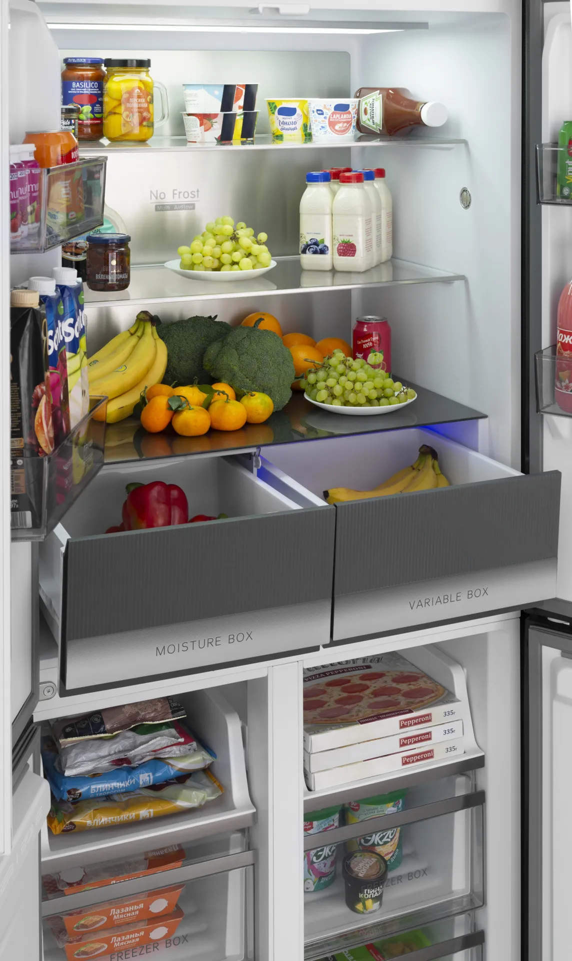 - Зона свежести —включает два ящика: MOISTURE BOX с влагоудерживающим модулем для предотвращения запахов и влаги, и VARIABLE BOX с регулируемой температурой от -3°C до +9°C для хранения различных продуктов.
