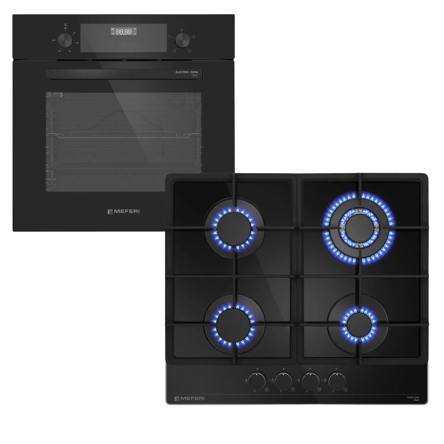 Комплект включает в себя электрический духовой шкаф MEO604BK POWER и газовую варочную панель MGH604BK GLASS POWER.