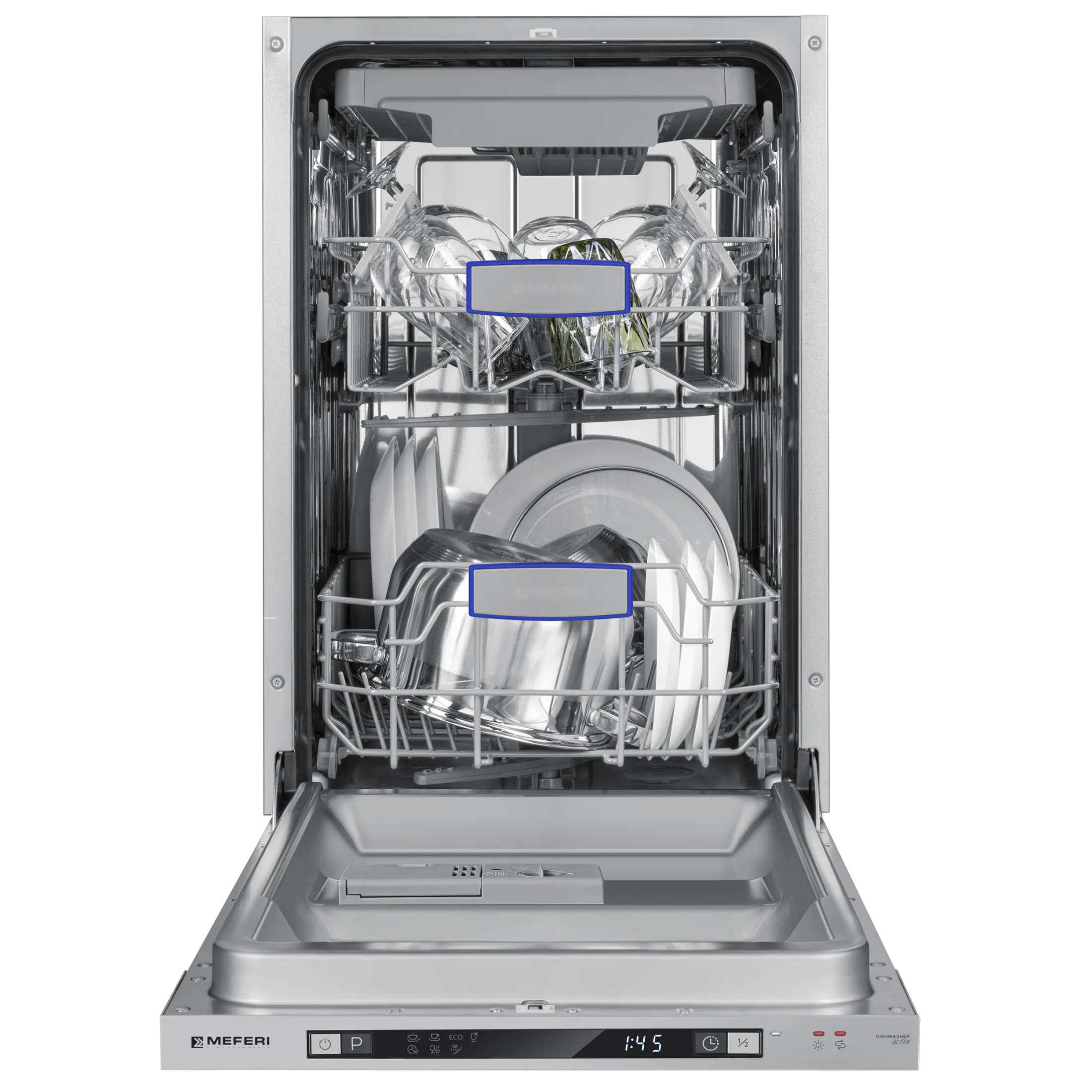 Посудомоечная машина узкая встраиваемая MEFERI MDW4573 ULTRA, 45 см, 10 комплектов посуды, 7 программ, 3 корзины, защита от протечек, луч на полу, внутренняя подсветка, половинная загрузка, отсрочка, таймер