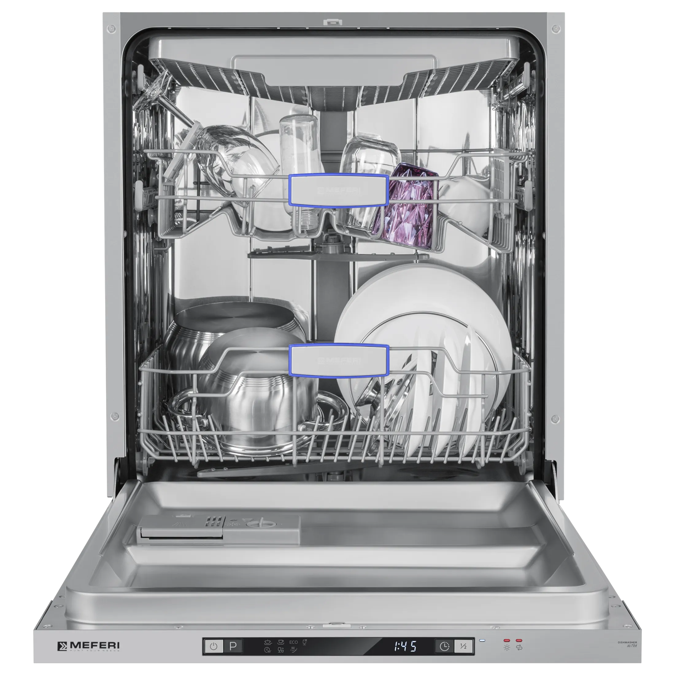Посудомоечная машина встраиваемая MEFERI MDW6073 ULTRA, 60 см, напольная, 14 комплектов посуды, 7 программ, 3 корзины, луч на полу, внутренняя подсветка, половинная загрузка