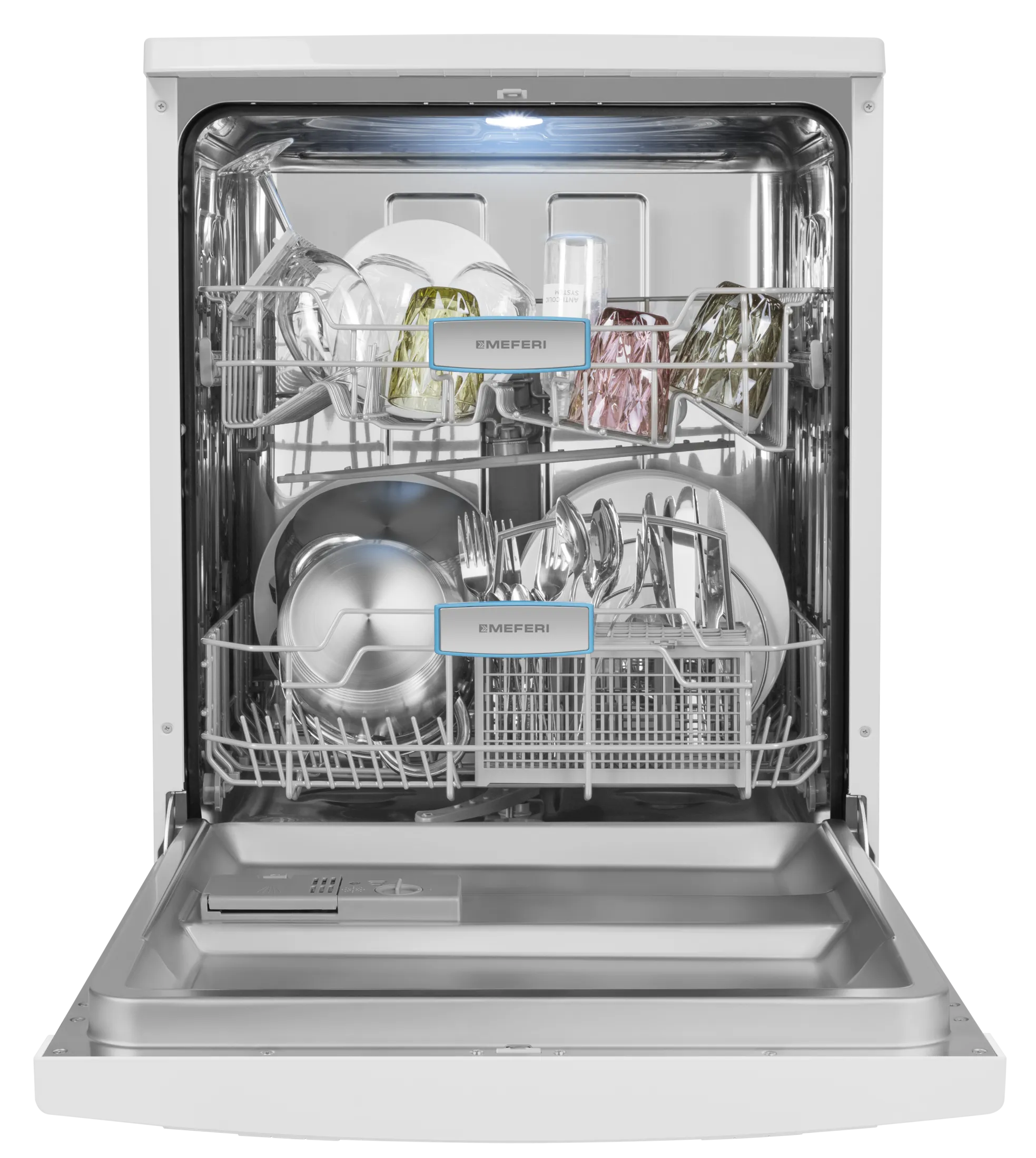 Посудомоечная машина отдельностоящая MEFERI MDW6062WH FS LIGHT, 60 см, напольная, 12 комплектов посуды, 6 программ, 2 корзины, половинная загрузка, отсрочка, защита от протечек, внутренняя подсветка