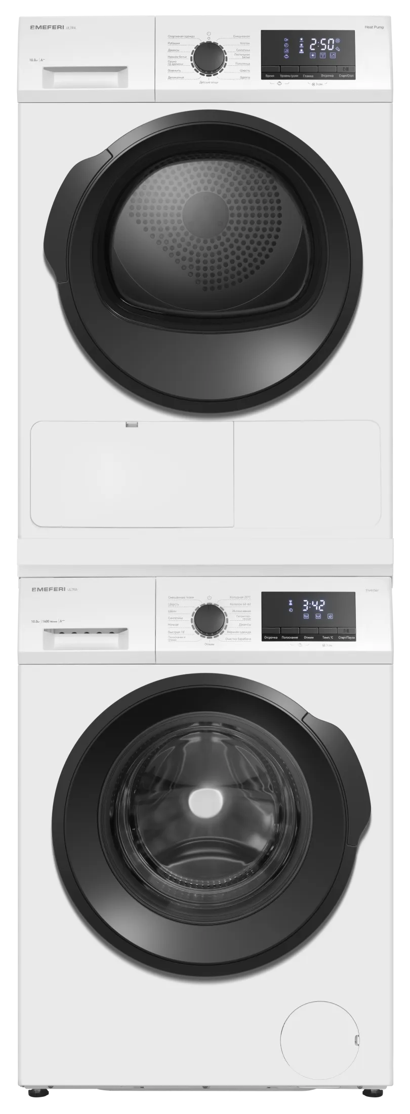 | Состав комплекта | Стиральная машина MEFERI MFW101415WH ULTRA; Сушильная машина MEFERI MDR1015WH HP ULTRA; Соединительный элемент MEFERI MCP10WH ULTRA |