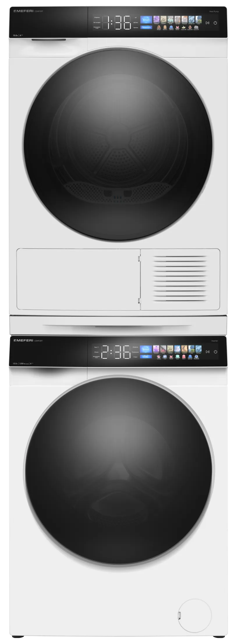 | Состав комплекта | Стиральная машина MEFERI MFW101216WH COMFORT; Сушильная машина MEFERI MDR1016WH HP COMFORT; Соединительный элемент MEFERI MCP10WH COMFORT |