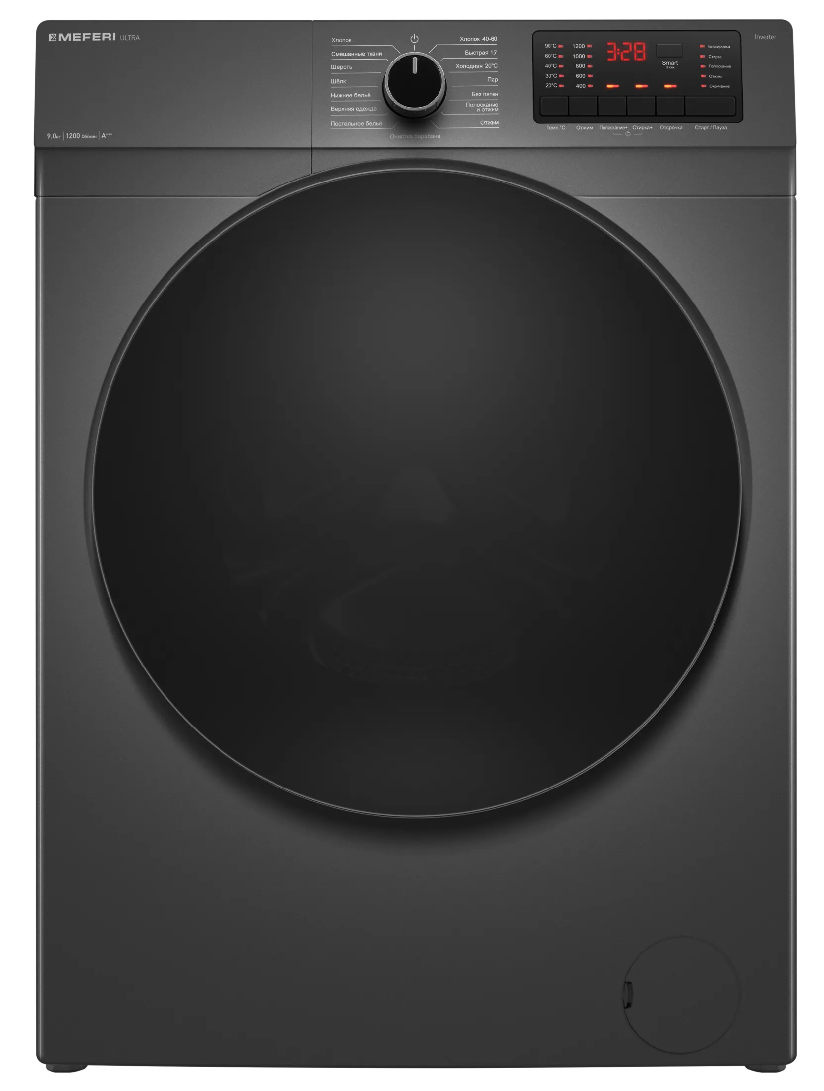 Стиральная машина MEFERI MFW091216GR ULTRA — стильная и функциональная отдельностоящая стиральная машина с инверторным мотором, выполненная в современном сером цвете с чёрной дверцей. Модель сочетает в себе тихую работу, долговечность и широкий выбор программ для бережного ухода за любыми тканями.