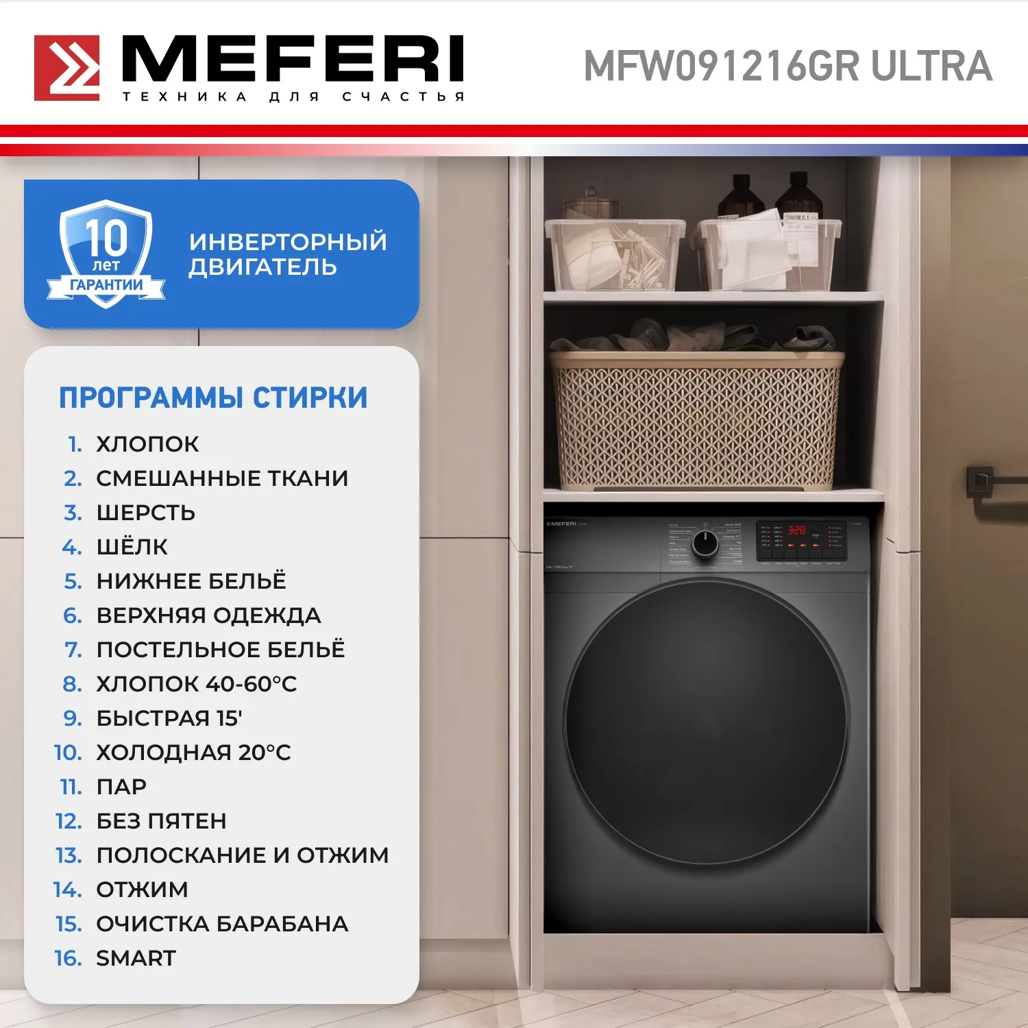 MEFERI MFW091216GR ULTRA — это сочетание элегантного дизайна и высокой функциональности, которое обеспечит качественную и бережную стирку каждый день!