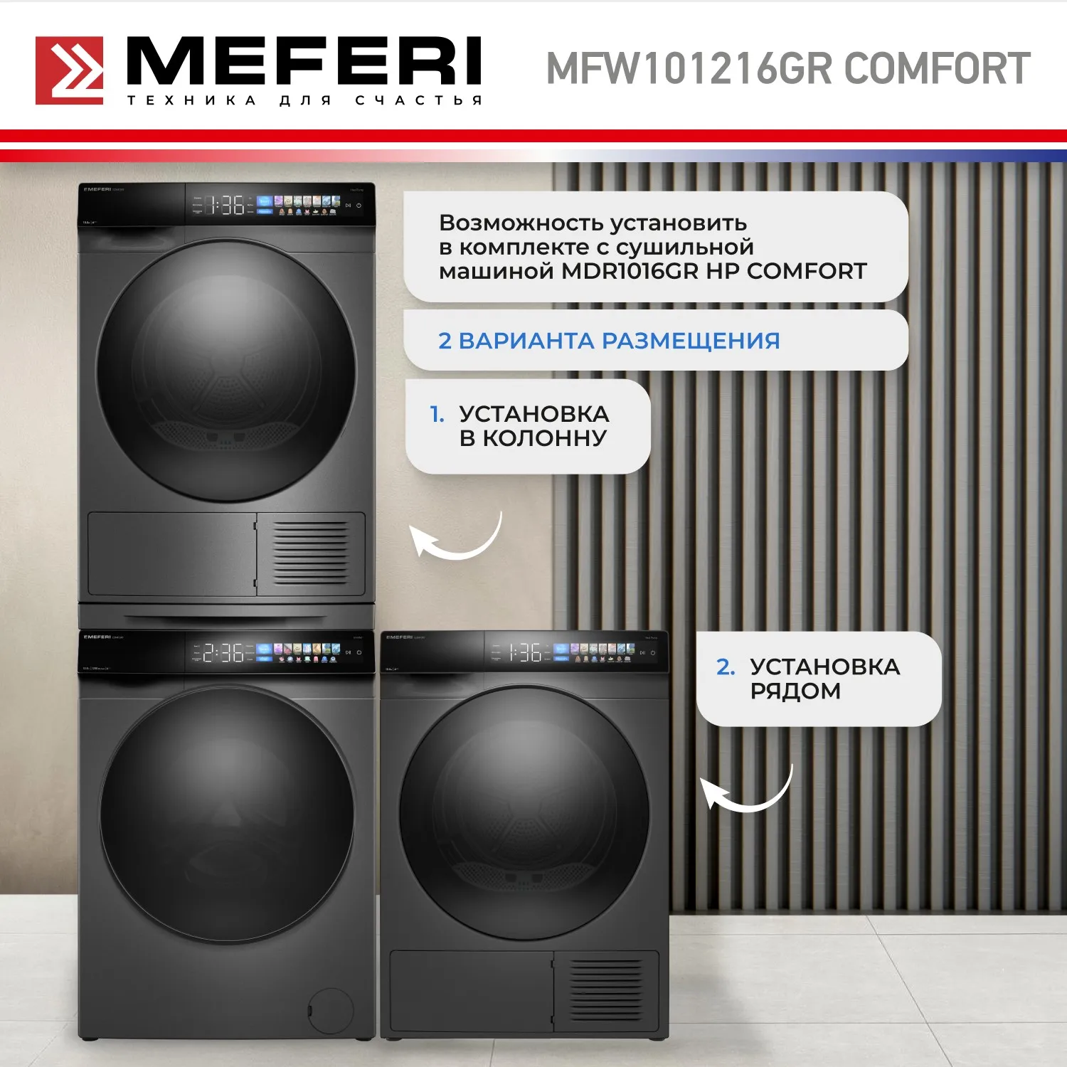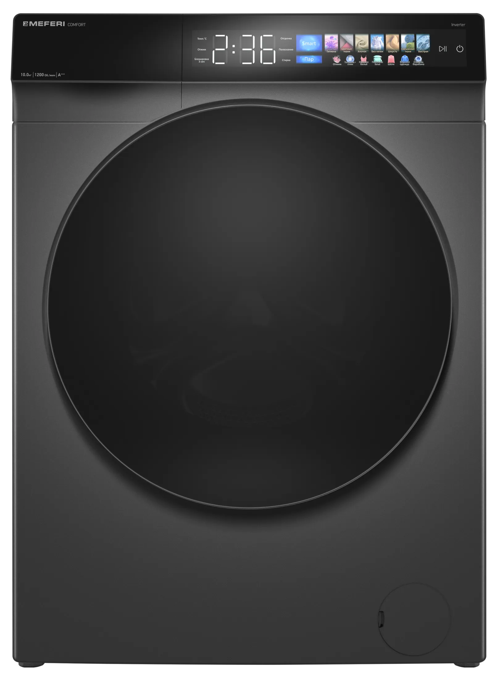 Стиральная машина с инвертором и паром MEFERI MFW101216GR COMFORT отдельностоящая серая, загрузка 10 кг, с возможностью установки в колонну, с сенсорным управлением