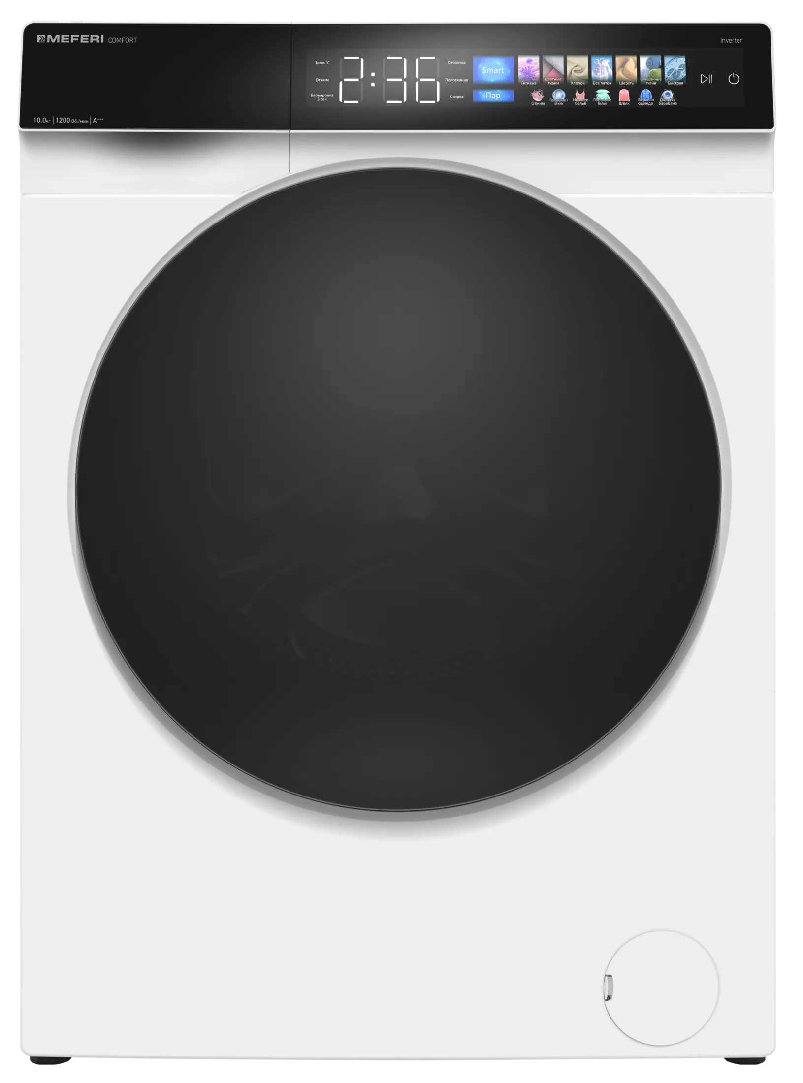 Стиральная машина с инвертором и паром MEFERI MFW101216WH COMFORT отдельностоящая белая, загрузка 10 кг, с возможностью установки в колонну, с сенсорным управлением