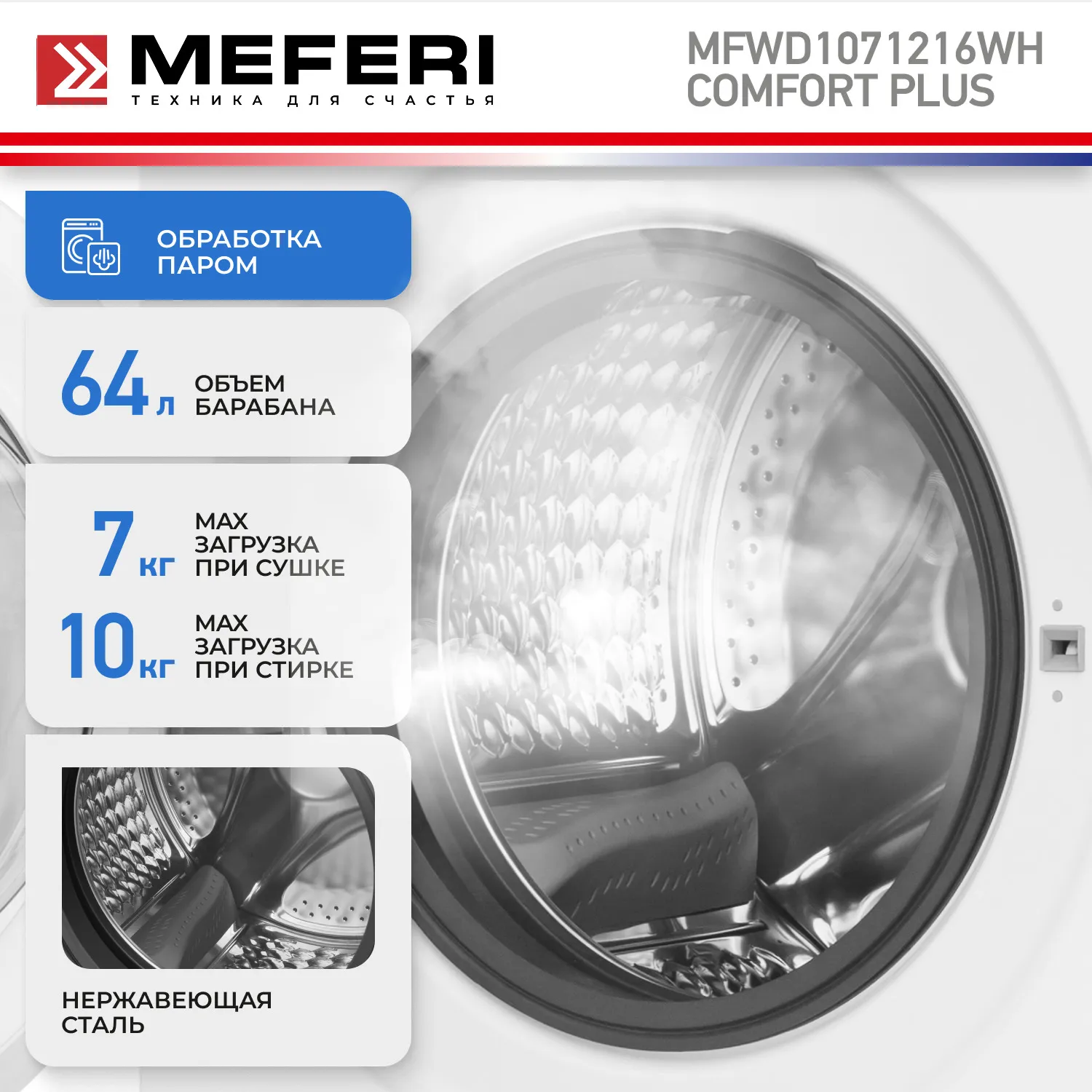 Стиральная машина с сушкой 2 в 1, инвертором и паром MEFERI MFWD1071216WH COMFORT PLUS (модификация 2026 года) отдельностоящая белая, с прямым приводом, загрузка 10 кг стирка, 7 кг сушка
