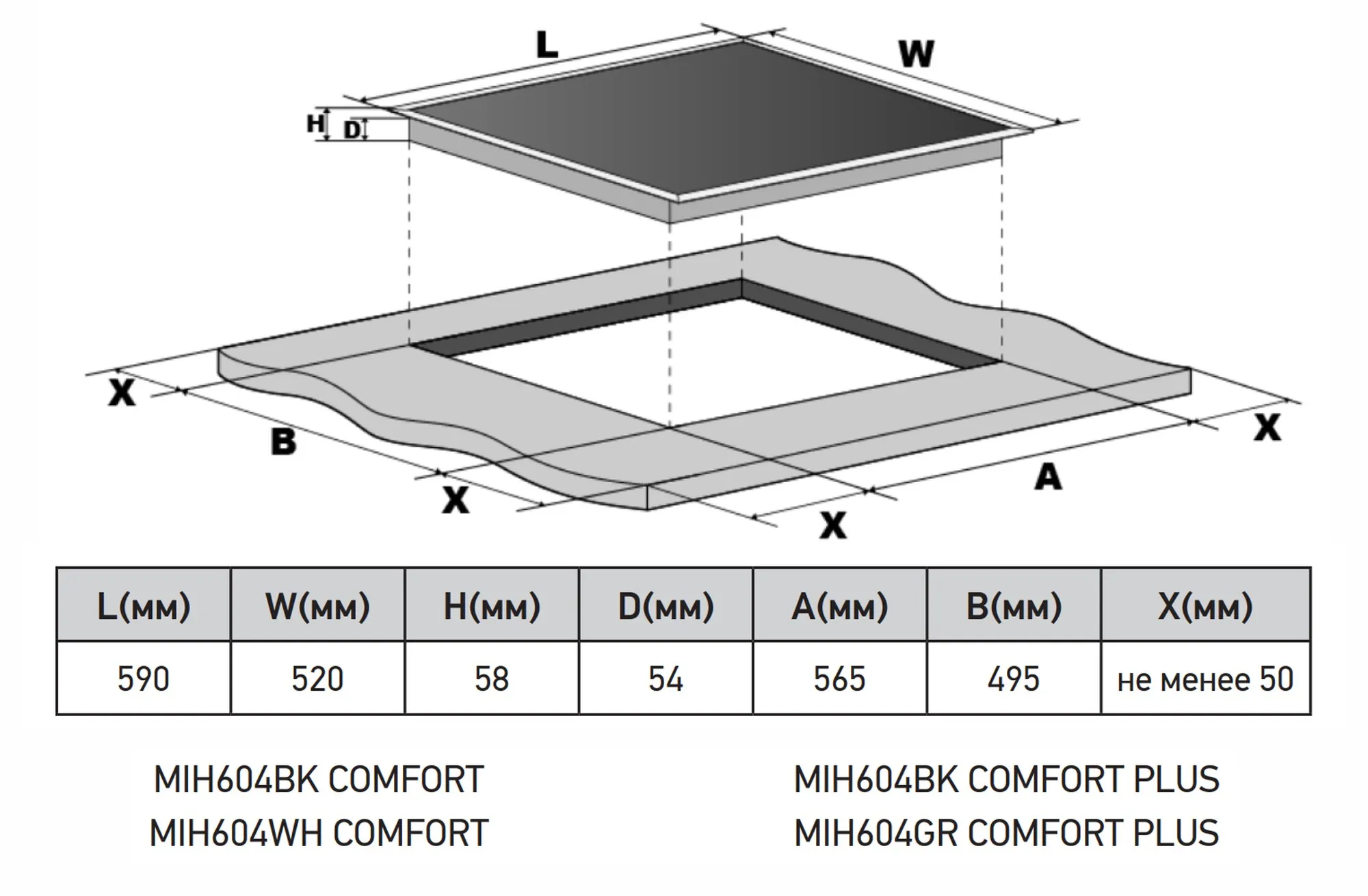 | Размеры зоны встраивания, мм | 565x495 |