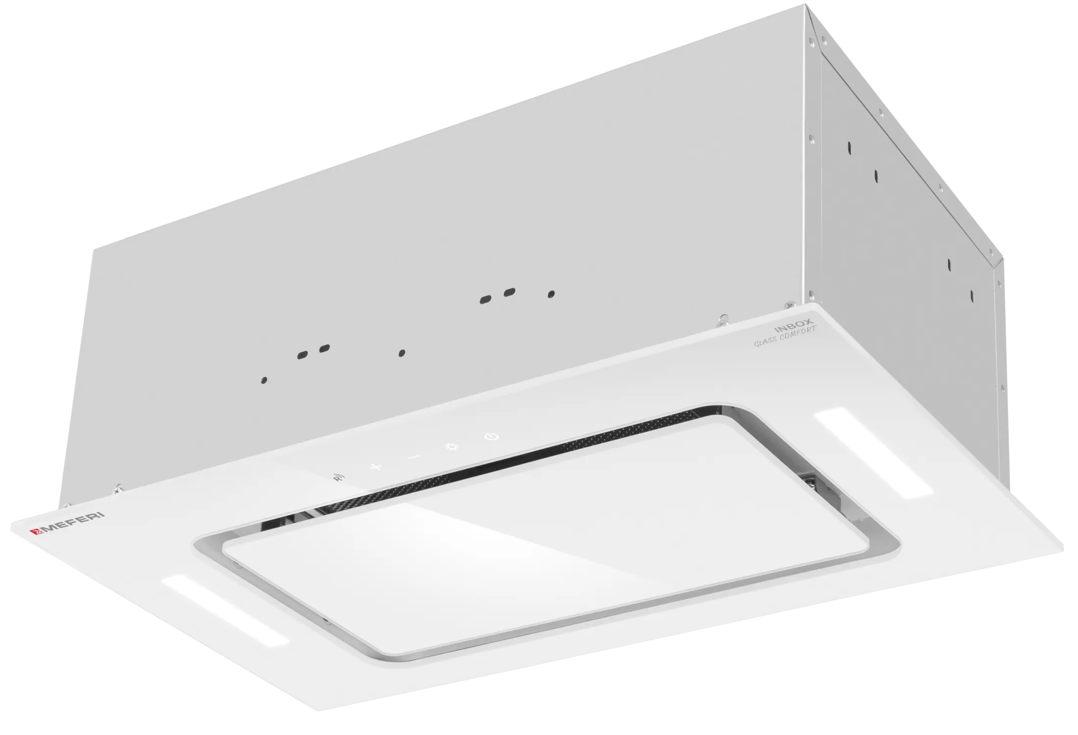 MEFERI INBOX52WH GLASS COMFORT — современная полновстраиваемая вытяжка с изящной белой стеклянной панелью, которая обеспечивает эффективную очистку воздуха и придает кухне элегантный и современный вид. Эта модель идеально подходит для кухонь площадью до 35 м², создавая комфорт и свежесть даже при интенсивной готовке.