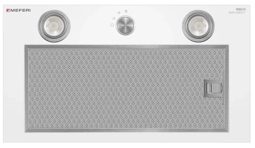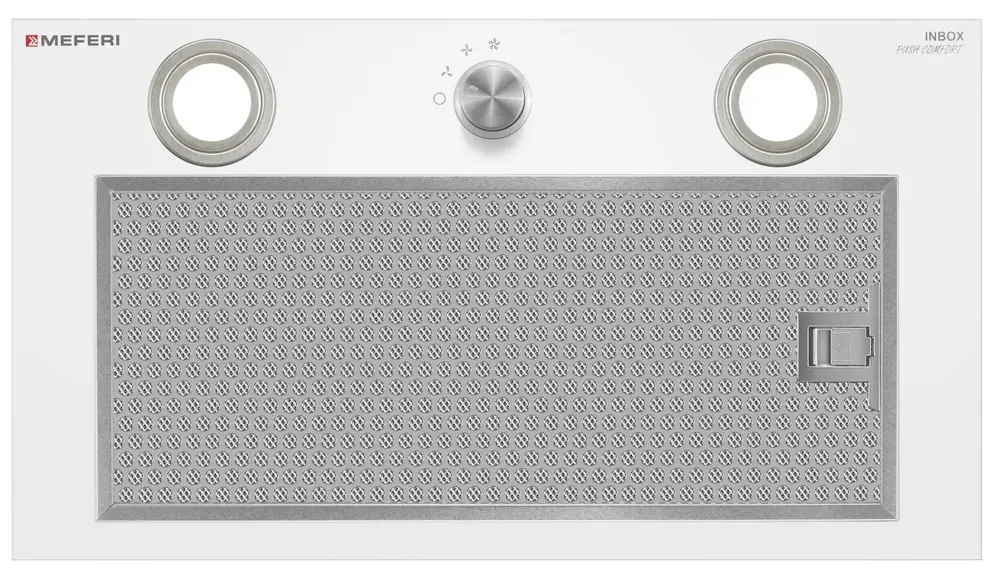 MEFERI INBOX52WH PUSH COMFORT — элегантная и высокоэффективная полновстраиваемая вытяжка в белом цвете, которая идеально подходит для кухонь площадью до 35 м². Благодаря современным технологиям и сенсорному управлению, она обеспечивает быструю и качественную очистку воздуха от пара, запахов и жира, создавая комфортную и свежую атмосферу на вашей кухне.