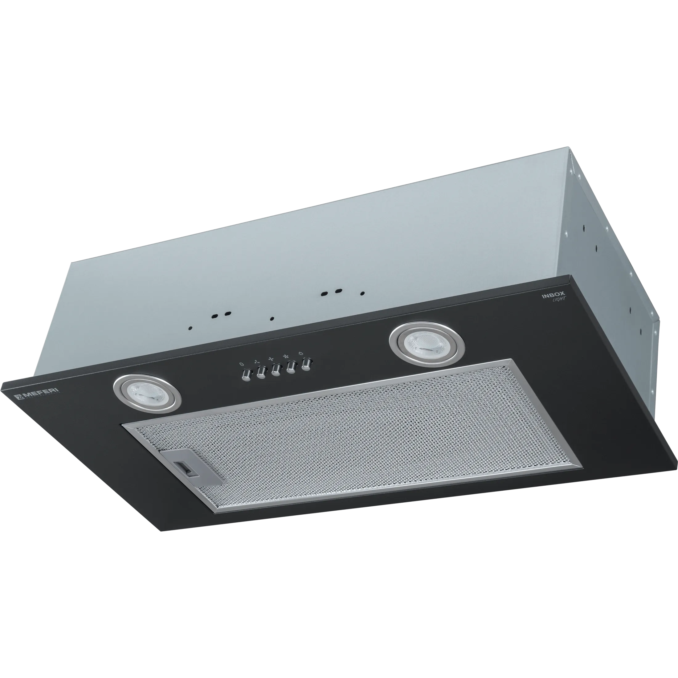 MEFERI INBOX60BK LIGHT — полновстраиваемая вытяжка с черным металлическим корпусом и производительностью 650 м³/ч для кухни до 30 м²