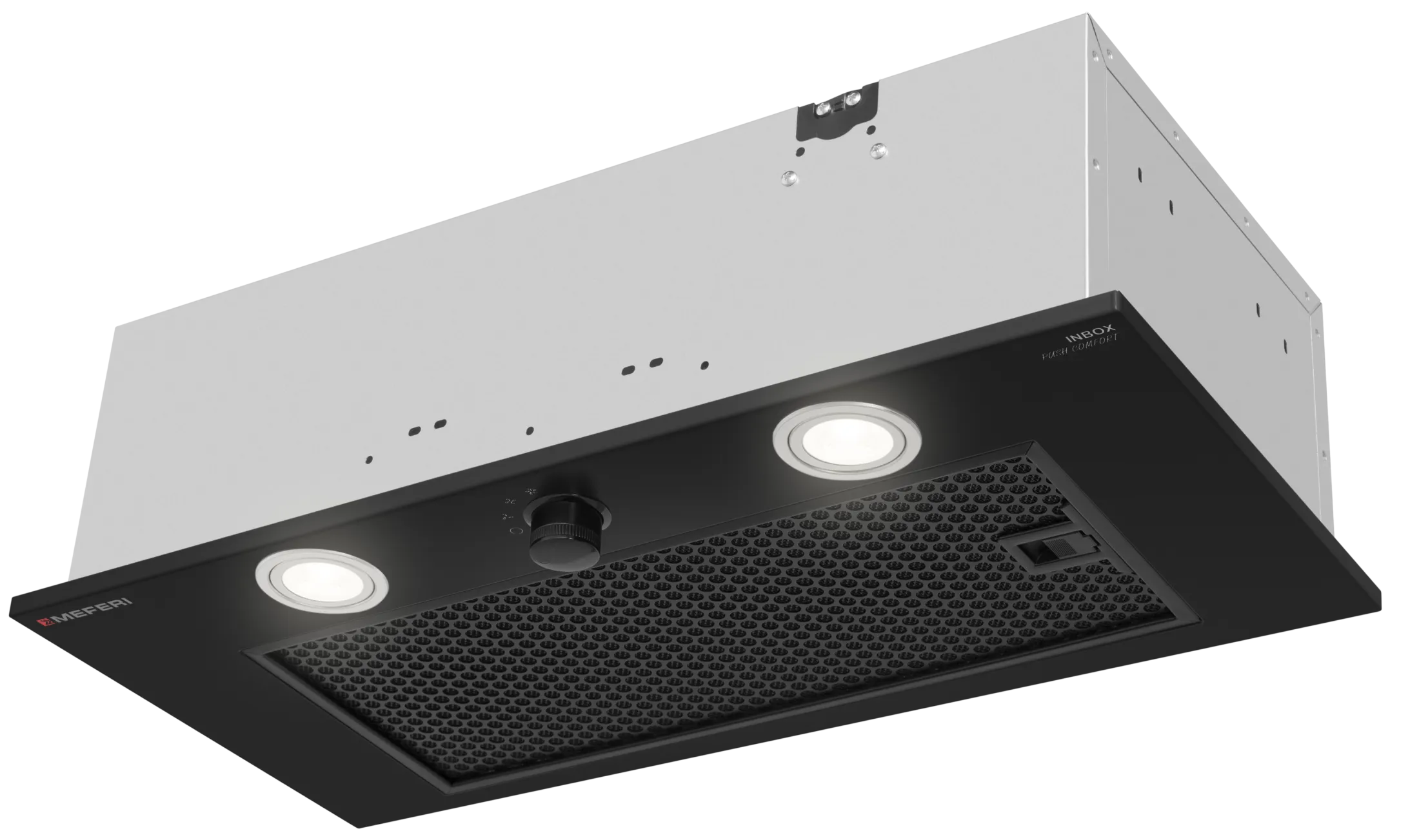 MEFERI INBOX60BK PUSH COMFORT — элегантная и мощная полновстраиваемая вытяжка в черном цвете с дизайном «Total Black», которая придаст вашей кухне современный и стильный вид. Идеально подходит для кухонь площадью до 35 м², обеспечивая эффективное удаление запахов, пара и жира, создавая свежий и чистый воздух даже при интенсивной готовке.