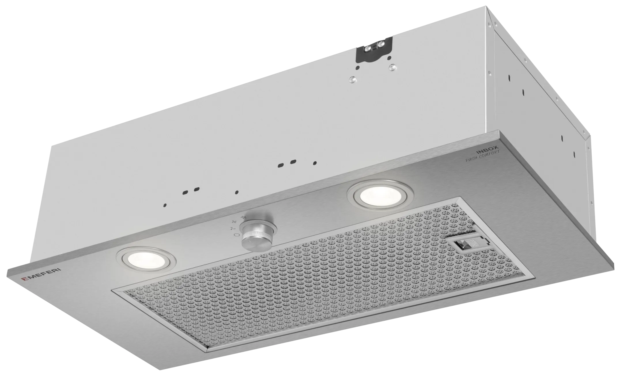 MEFERI INBOX60IX PUSH COMFORT — современная и надежная полновстраиваемая вытяжка из нержавеющей стали, идеально подходящая для кухонь площадью до 30 м². Эта модель сочетает элегантный дизайн и высокую производительность, обеспечивая эффективное удаление запахов, пара и жира, создавая свежую и комфортную атмосферу на вашей кухне.