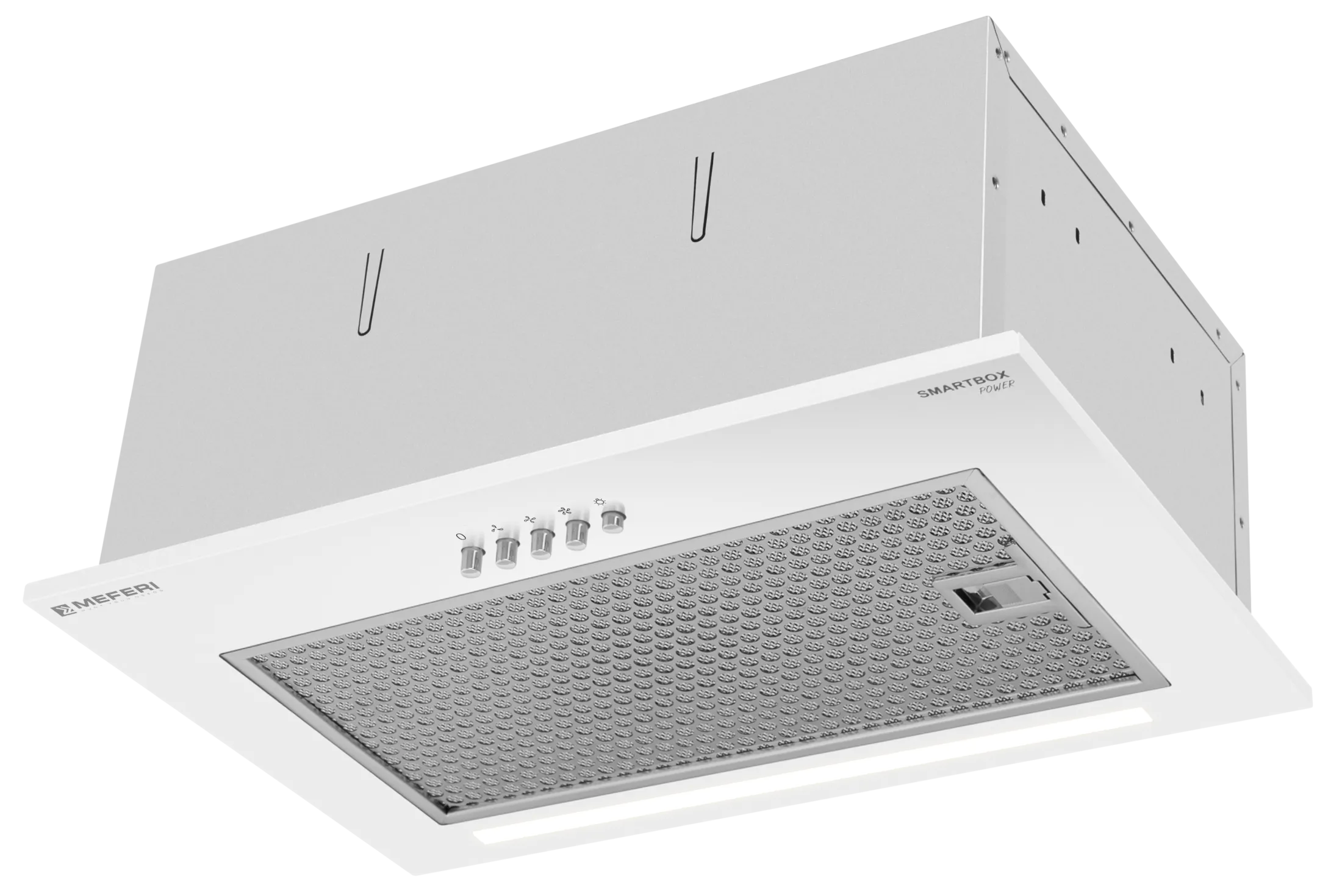 MEFERI SMARTBOX45WH POWER — мощная полновстраиваемая вытяжка с белым корпусом и производительностью 900 м³/ч для кухни до 35 м²