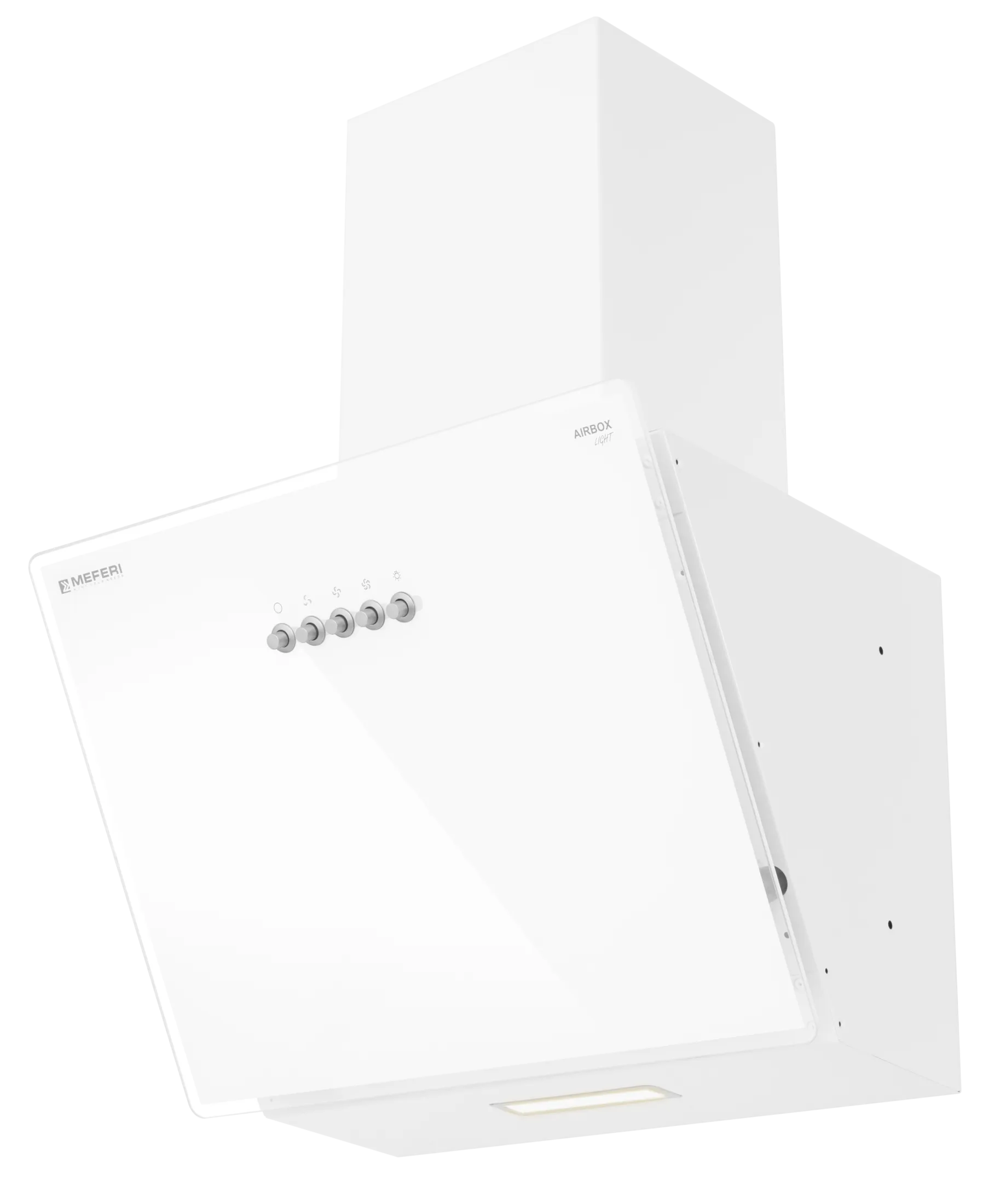 MEFERI AIRBOX45WH LIGHT — современная наклонная вытяжка с белой стеклянной панелью и дизайном «Total White», созданная для кухонь площадью до 25 м². Эта модель обеспечивает высокую производительность и эффективное удаление запахов, пара и жира, поддерживая свежий и чистый воздух даже при интенсивной готовке.