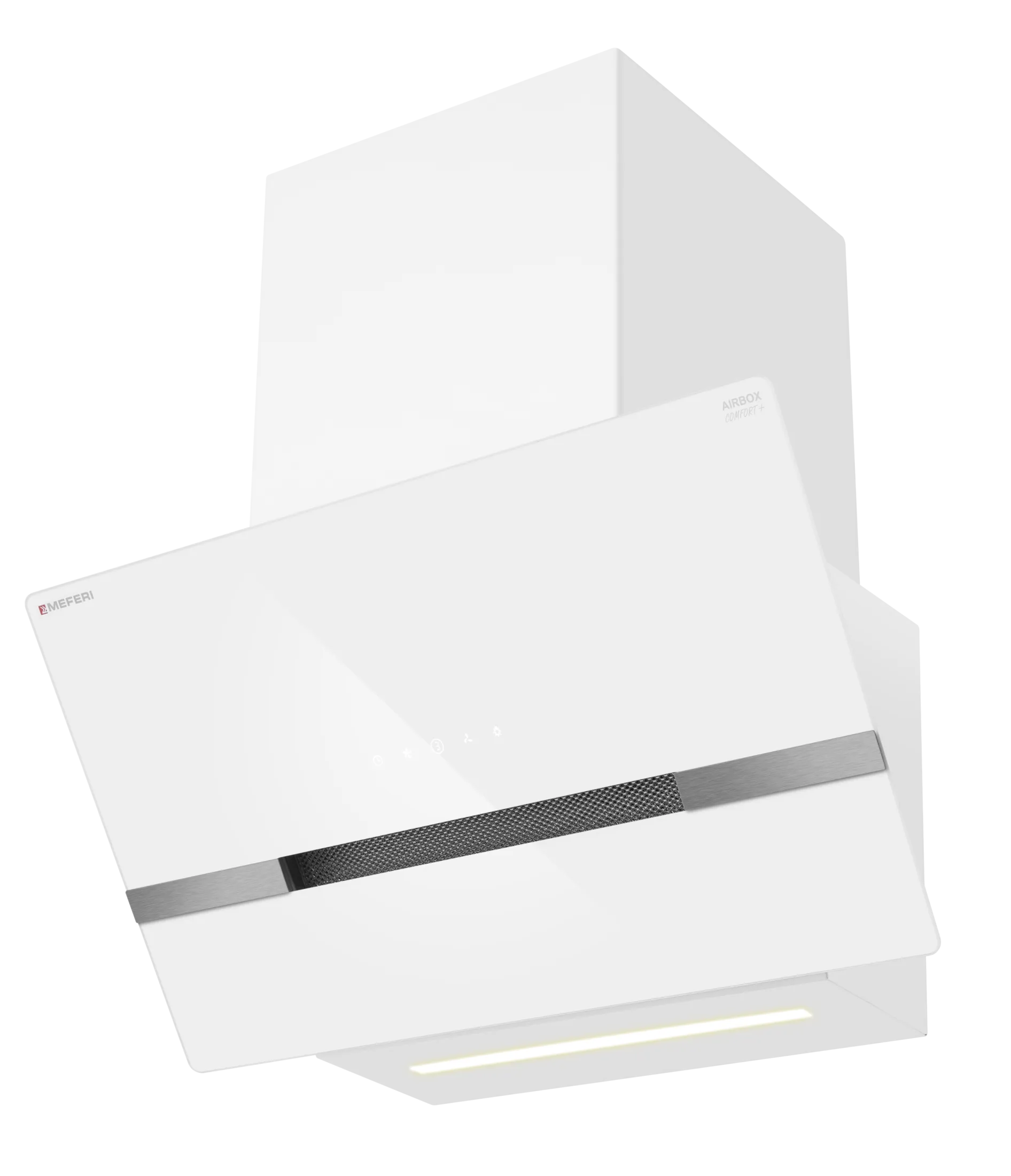 MEFERI AIRBOX60WH COMFORT PLUS — высокопроизводительная вытяжка с белой стеклянной панелью и современным дизайном «Total White», созданная для больших кухонь площадью до 40 м². Эта модель обеспечивает эффективную и быструю очистку воздуха от пара, запахов и жира даже при интенсивной готовке, создавая комфорт и свежесть на вашей кухне.