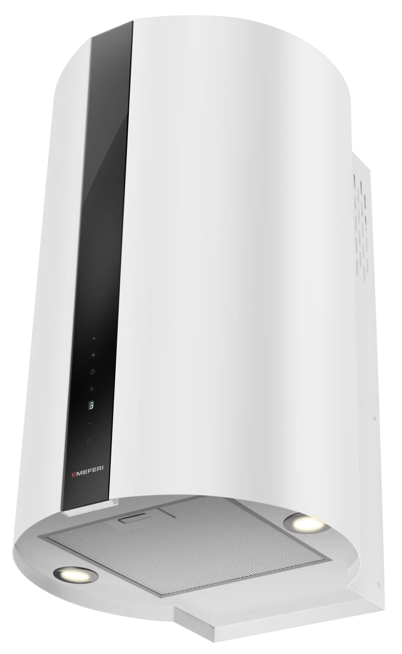 MEFERI TUBE40WH COMFORT PLUS — мощная цилиндрическая пристенная вытяжка с сенсорным управлением и декоративной стеклянной панелью для кухни до 40 м²