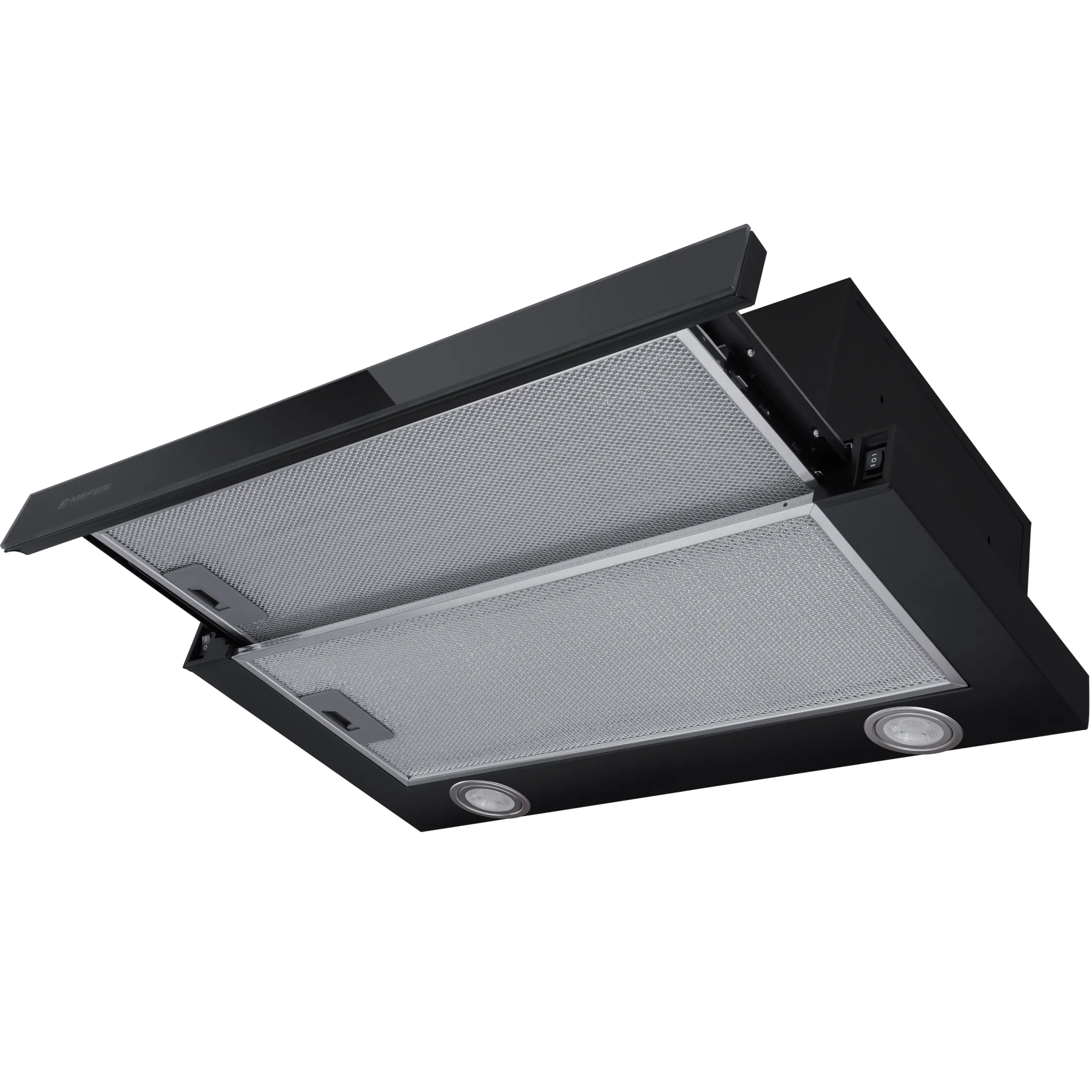 MEFERI SLIDEBOX60BK GLASS ULTRA — телескопическая встраиваемая вытяжка с черной стеклянной панелью и мощностью 850 м³/ч для кухни до 30 м²