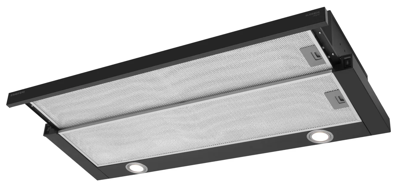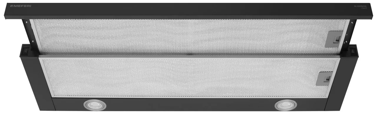 MEFERI SLIDEBOX90BK POWER — телескопическая встраиваемая вытяжка с черным корпусом и мощностью 900 м³/ч для кухни до 33 м²